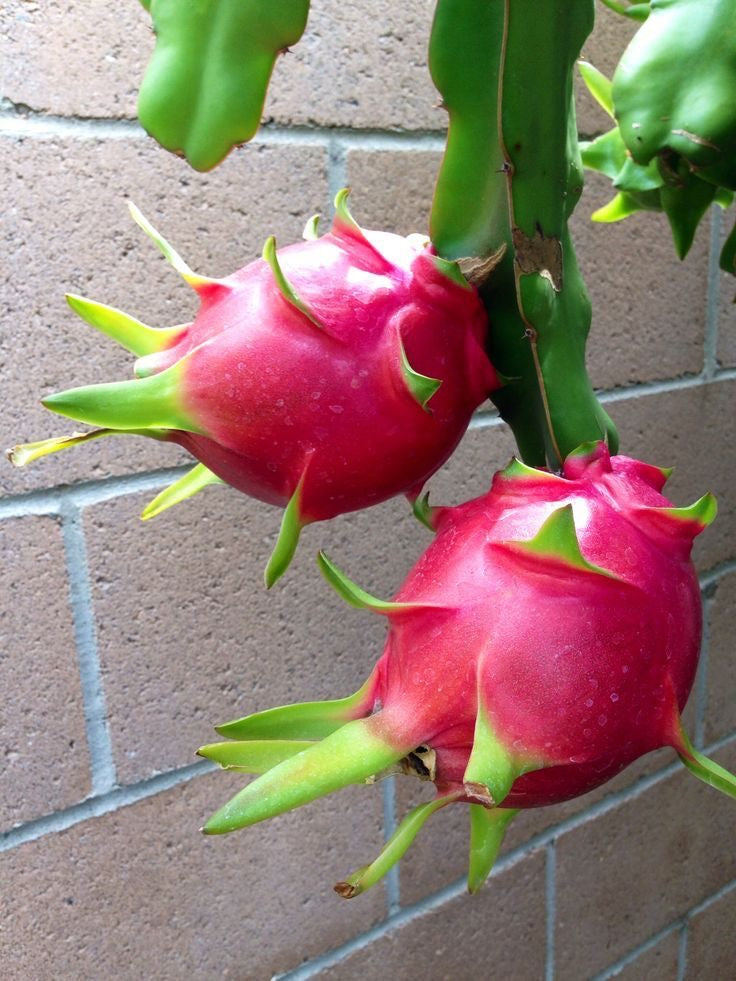 Climbing cactus, produces pink/yellow fruits with white/red flesh.